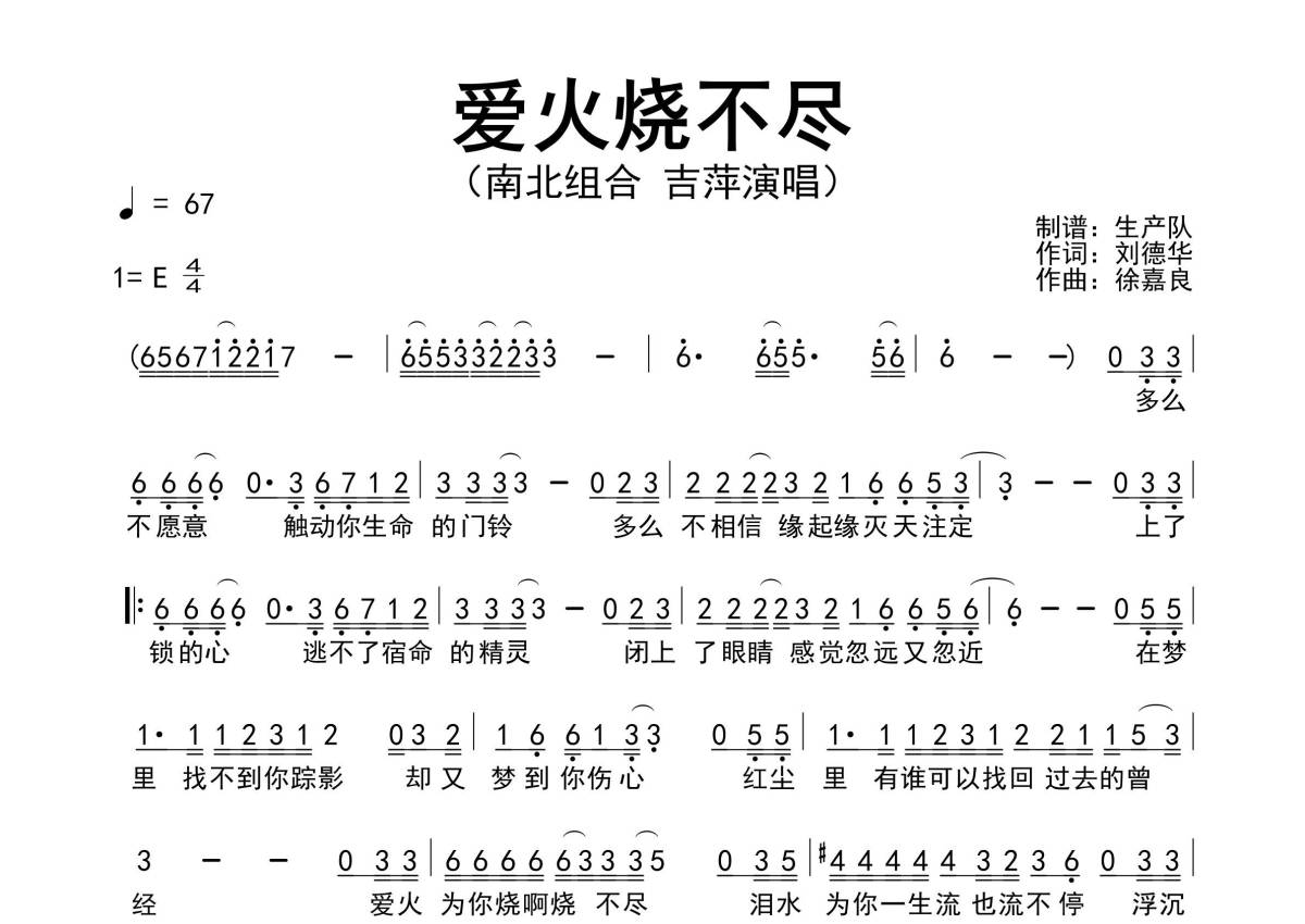 《爱火烧不尽》是吉萍演唱的一首歌曲,原版简谱,拍号为4/4拍,歌曲速度为每分钟67拍,这份简谱共有一张高清图谱,图谱由 @生产队 编配上传南北组合 吉萍翻唱的经典歌曲《爱火烧不尽》原版简谱。