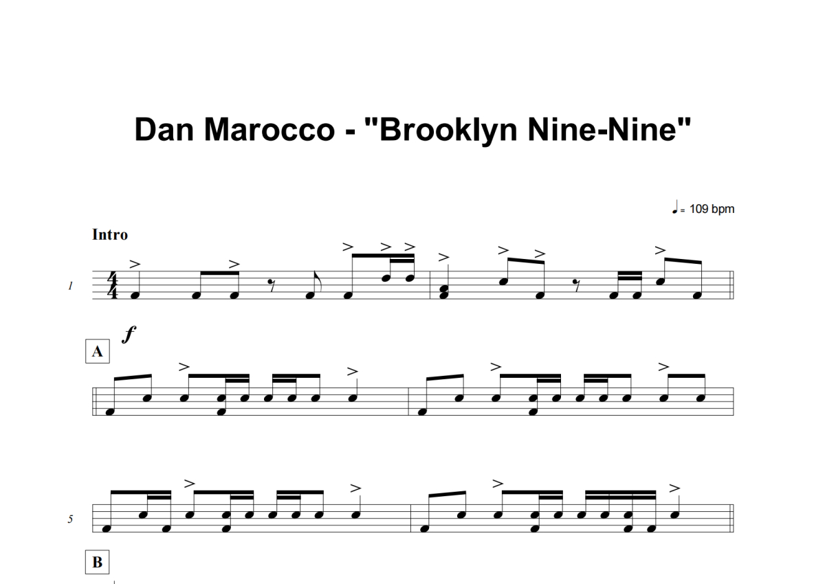《Brooklyn Nine-Nine》是Dan Marocco演唱的一首歌曲,这份架子鼓谱共有两张高清图谱,图谱由 @司空千落 编配上传,图谱使用五线谱编配,使用这份Brooklyn Nine-Nine架子鼓谱,你将能够轻松地敲打出这首Dan Marocco的Brooklyn Nine-Nine,快来尝试吧。
