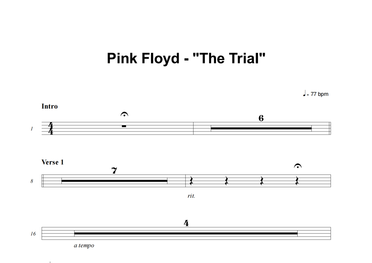 《The Trial》是Pink Floyd演唱的一首歌曲,这份架子鼓谱共有三张高清图谱,图谱由 @司空千落 编配上传,图谱使用五线谱编配,使用这份The Trial架子鼓谱,你将能够轻松地敲打出这首Pink Floyd的The Trial,快来尝试吧。