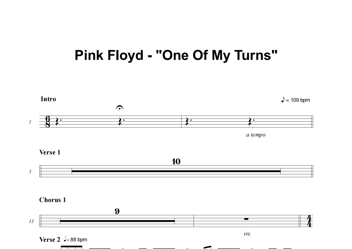 《One Of My Turns》是Pink Floyd演唱的一首歌曲,这份架子鼓谱共有两张高清图谱,图谱由 @司空千落 编配上传,图谱使用五线谱编配,使用这份One Of My Turns架子鼓谱,你将能够轻松地敲打出这首Pink Floyd的One Of My Turns,快来尝试吧。