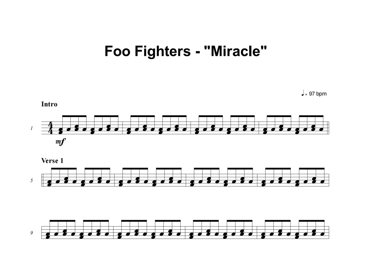 《Miracle》是Foo Fighters演唱的一首歌曲,这份架子鼓谱共有三张高清图谱,图谱由 @司空千落 编配上传,图谱使用五线谱编配,使用这份Miracle架子鼓谱,你将能够轻松地敲打出这首Foo Fighters的Miracle,快来尝试吧。