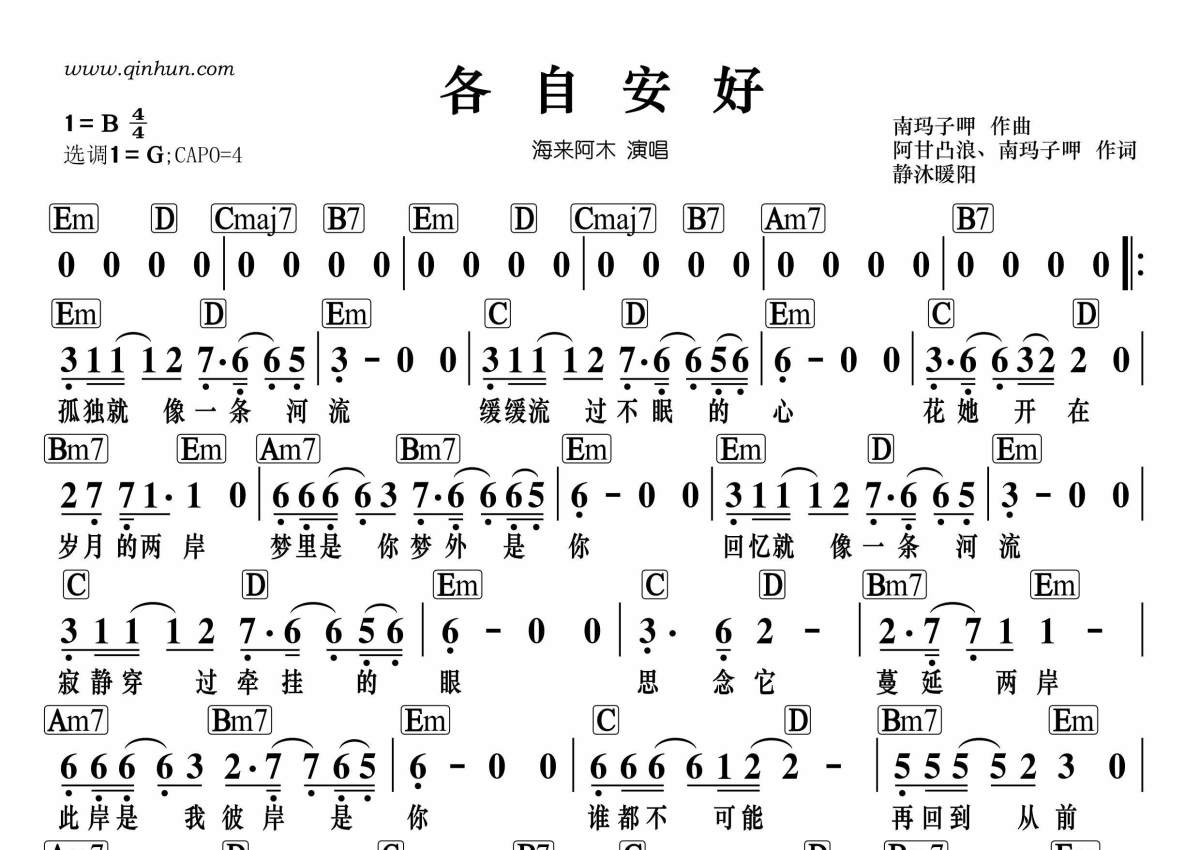 《各自安好》是婷儿演唱的一首歌曲,带和弦版,这份简谱共有一张高清图谱,图谱由 @静沐暖阳 编配上传。