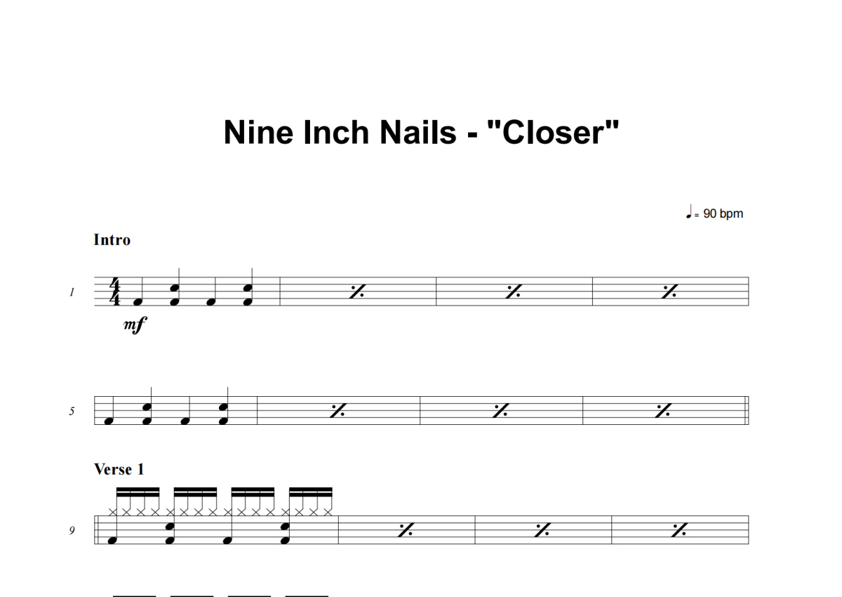 《Closer》是Nine Inch Nails演唱的一首歌曲,这份架子鼓谱共有四张高清图谱,图谱由 @司空千落 编配上传,图谱使用五线谱编配,使用这份Closer架子鼓谱,你将能够轻松地敲打出这首Nine Inch Nails的Closer,快来尝试吧。