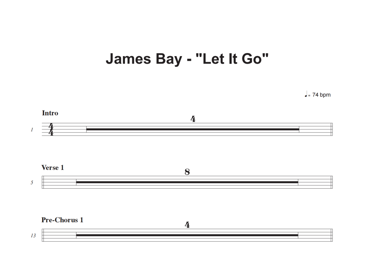 《Let It Go》是James Bay演唱的一首歌曲,这份架子鼓谱共有三张高清图谱,图谱由 @司空千落 编配上传,图谱使用五线谱编配,使用这份Let It Go架子鼓谱,你将能够轻松地敲打出这首James Bay的Let It Go,快来尝试吧。