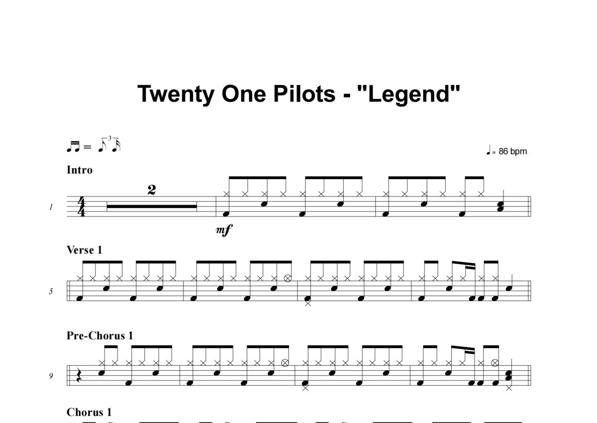 《Legend》是Twenty One Pilots演唱的一首歌曲,这份架子鼓谱共有两张高清图谱,图谱由 @司空千落 编配上传,图谱使用五线谱编配,使用这份Legend架子鼓谱,你将能够轻松地敲打出这首Twenty One Pilots的Legend,快来尝试吧。