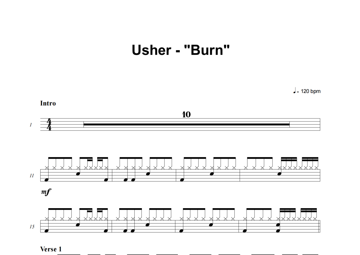 《Burn》是Usher演唱的一首歌曲,这份架子鼓谱共有三张高清图谱,图谱由 @司空千落 编配上传,图谱使用五线谱编配,使用这份Burn架子鼓谱,你将能够轻松地敲打出这首Usher的Burn,快来尝试吧。
