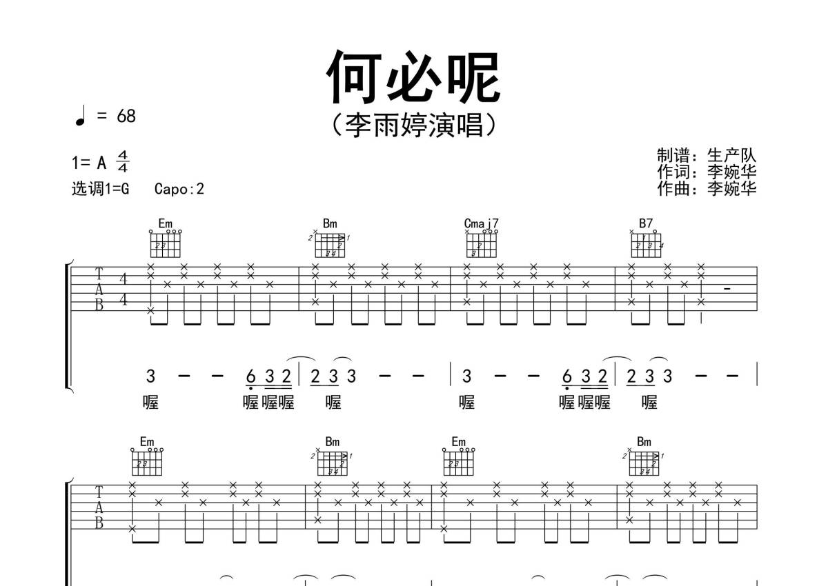 《何必呢》是李雨婷演唱的一首歌曲,精编完美版,拍号为4/4拍,歌曲速度为每分钟68拍,歌曲原调为A调,但由于原调指法比较难,为了方便弹奏,本吉他谱采用的是G调指法编配,变调夹2品弹奏即为原调,当然也可以根据自己的音域改变变调夹位置,或者通过改变和弦调性,以方便自己弹奏,这份吉他谱共有三张高清图谱,图谱由 @生产队 编配上传,图谱使用六线谱编配,包含吉他和弦指法、简谱以及歌词部分,使用这份何必呢吉他谱,可以让你更加方便地掌握这首歌曲的弹唱技巧,快来尝试吧。《何必呢》是由李雨婷演唱的最新单曲。本吉他谱根据原版G调指法编配,完整的前奏、间奏和solo编配。曾经曾经曾经,曾经爱过,如今如今如今,还在拉扯;算了算了算了,别再纠葛,挣脱挣脱挣脱,你给的枷锁。
