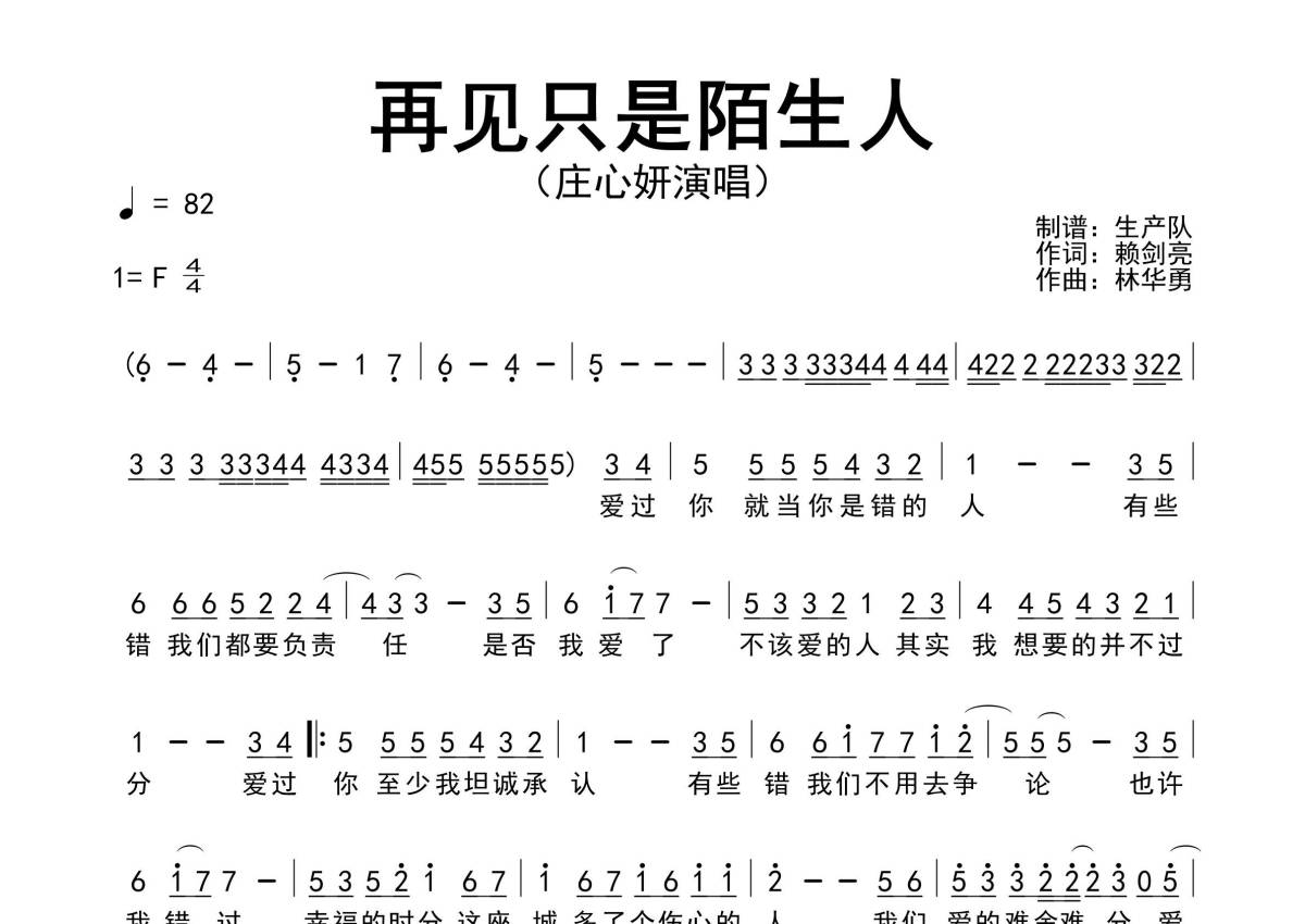 《再见只是陌生人》是庄心妍演唱的一首歌曲,原版简谱,拍号为4/4拍,歌曲速度为每分钟82拍,这份简谱共有一张高清图谱,图谱由 @生产队 编配上传庄心妍演唱的歌曲《再见只是陌生人》原版简谱。