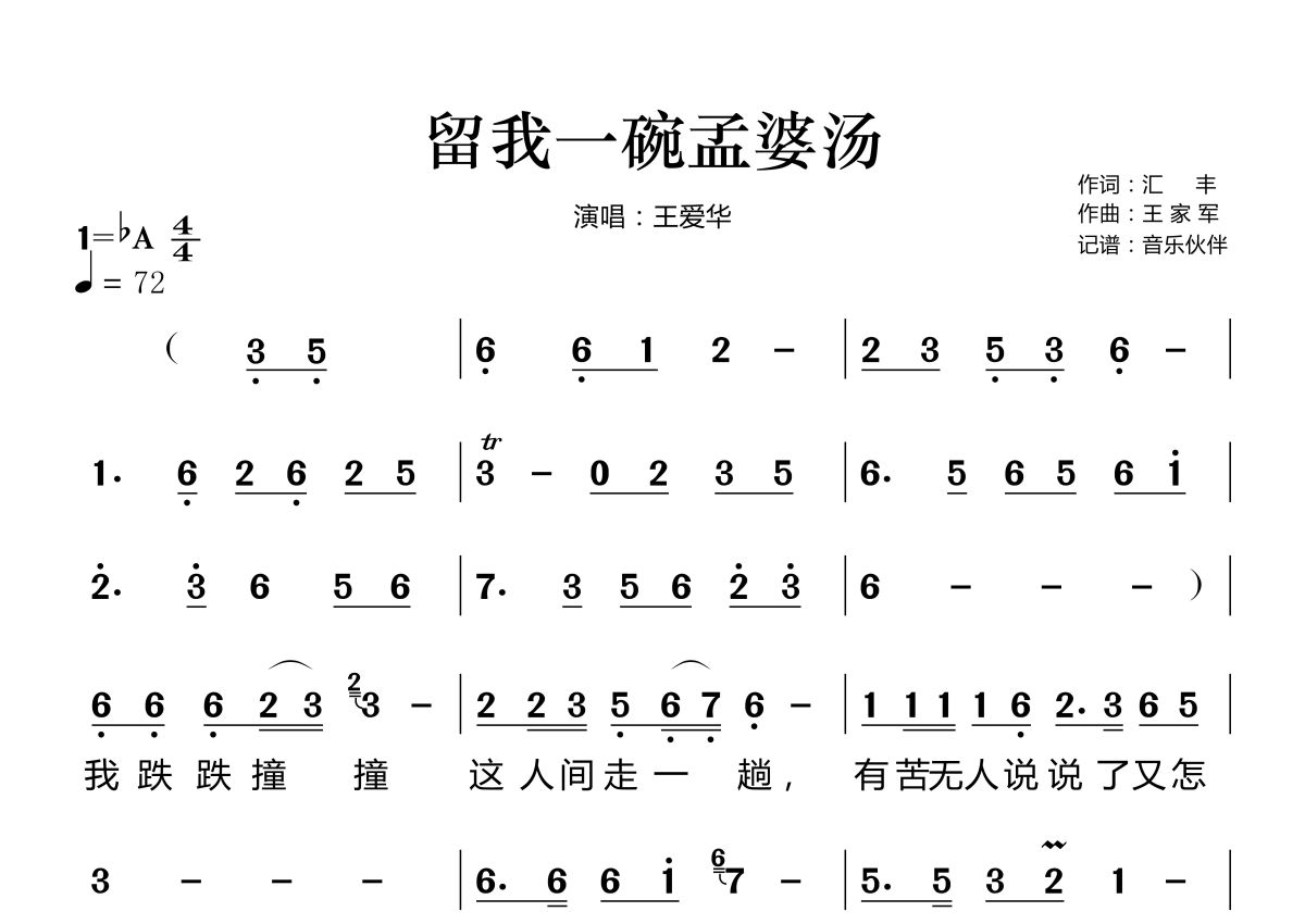 《留我一碗孟婆汤》是王爱华演唱的一首歌曲,这份简谱共有两张高清图谱,图谱由 @音乐伙伴 编配上传。