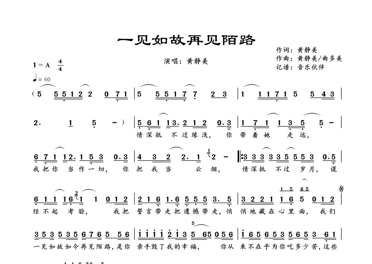 《一见如故再见陌路》是黄静美演唱的一首歌曲,拍号为4/4拍,歌曲速度为每分钟60拍,这份简谱共有一张高清图谱,图谱由 @音乐伙伴 编配上传。