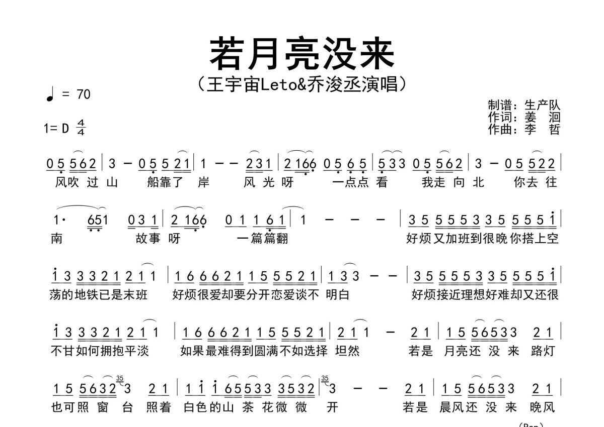 《若月亮没来》是王宇宙Leto/乔浚丞演唱的一首歌曲,原版简谱,拍号为4/4拍,歌曲速度为每分钟70拍,这份简谱共有一张高清图谱,图谱由 @生产队 编配上传王宇宙Leto/乔浚丞演唱的歌曲《若月亮没来》原版简谱。