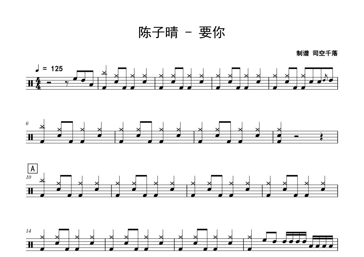 《要你》是陈子晴演唱的一首歌曲,这份架子鼓谱共有三张高清图谱,图谱由 @司空千落 编配上传,图谱使用五线谱编配,使用这份要你架子鼓谱,你将能够轻松地敲打出这首陈子晴的要你,快来尝试吧。
