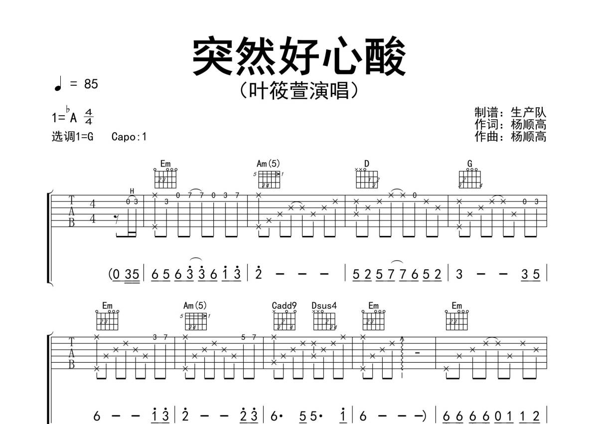 《突然好心酸》是叶筱萱演唱的一首歌曲,精编完美版,拍号为4/4拍,歌曲速度为每分钟85拍,歌曲原调为Ab调,但由于原调指法比较难,为了方便弹奏,本吉他谱采用的是G调指法编配,变调夹1品弹奏即为原调,当然也可以根据自己的音域改变变调夹位置,或者通过改变和弦调性,以方便自己弹奏,这份吉他谱共有三张高清图谱,图谱由 @生产队 编配上传,图谱使用六线谱编配,包含吉他和弦指法、简谱以及歌词部分,使用这份突然好心酸吉他谱,可以让你更加方便地掌握这首歌曲的弹唱技巧,快来尝试吧。《突然好心酸》是由歌手叶筱萱演唱的歌曲。本吉他谱根据原版G调指法编配,精准的前奏、间奏、尾奏和solo编配,精编完美版,值得推荐。突然好心酸,眼泪不停打转,想想这些年过得好难;有再多不甘,又能够怎么办,自己选择的路自己走完。