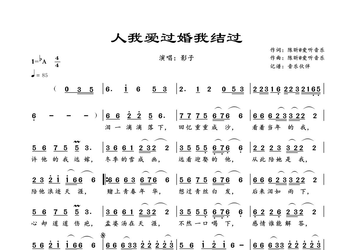 《人我爱过婚我结过》是影子演唱的一首歌曲,拍号为4/4拍,歌曲速度为每分钟85拍,这份简谱共有一张高清图谱,图谱由 @音乐伙伴 编配上传。