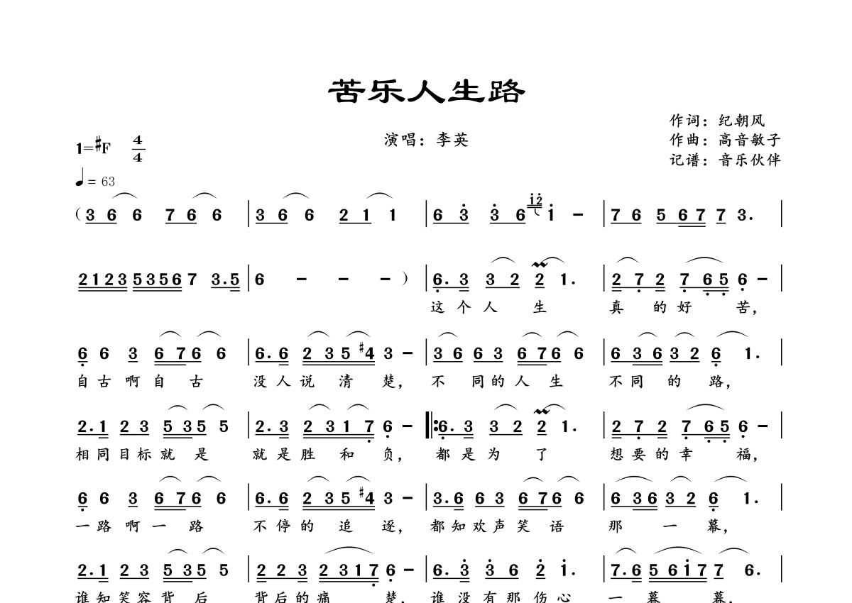 《苦乐人生路》是李英演唱的一首歌曲,拍号为4/4拍,歌曲速度为每分钟63拍,这份简谱共有一张高清图谱,图谱由 @音乐伙伴 编配上传。