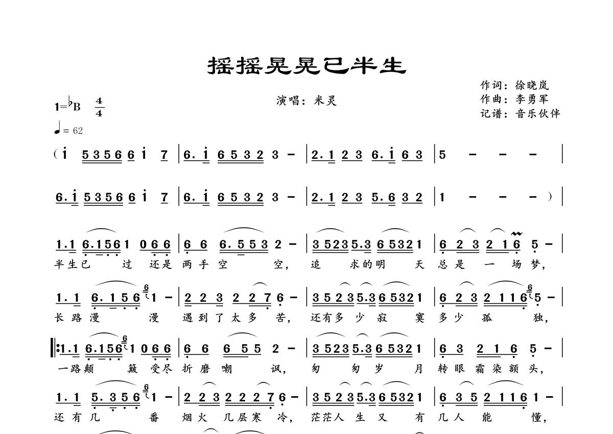 《摇摇晃晃已半生》是米灵演唱的一首歌曲,拍号为4/4拍,歌曲速度为每分钟62拍,这份简谱共有一张高清图谱,图谱由 @音乐伙伴 编配上传。