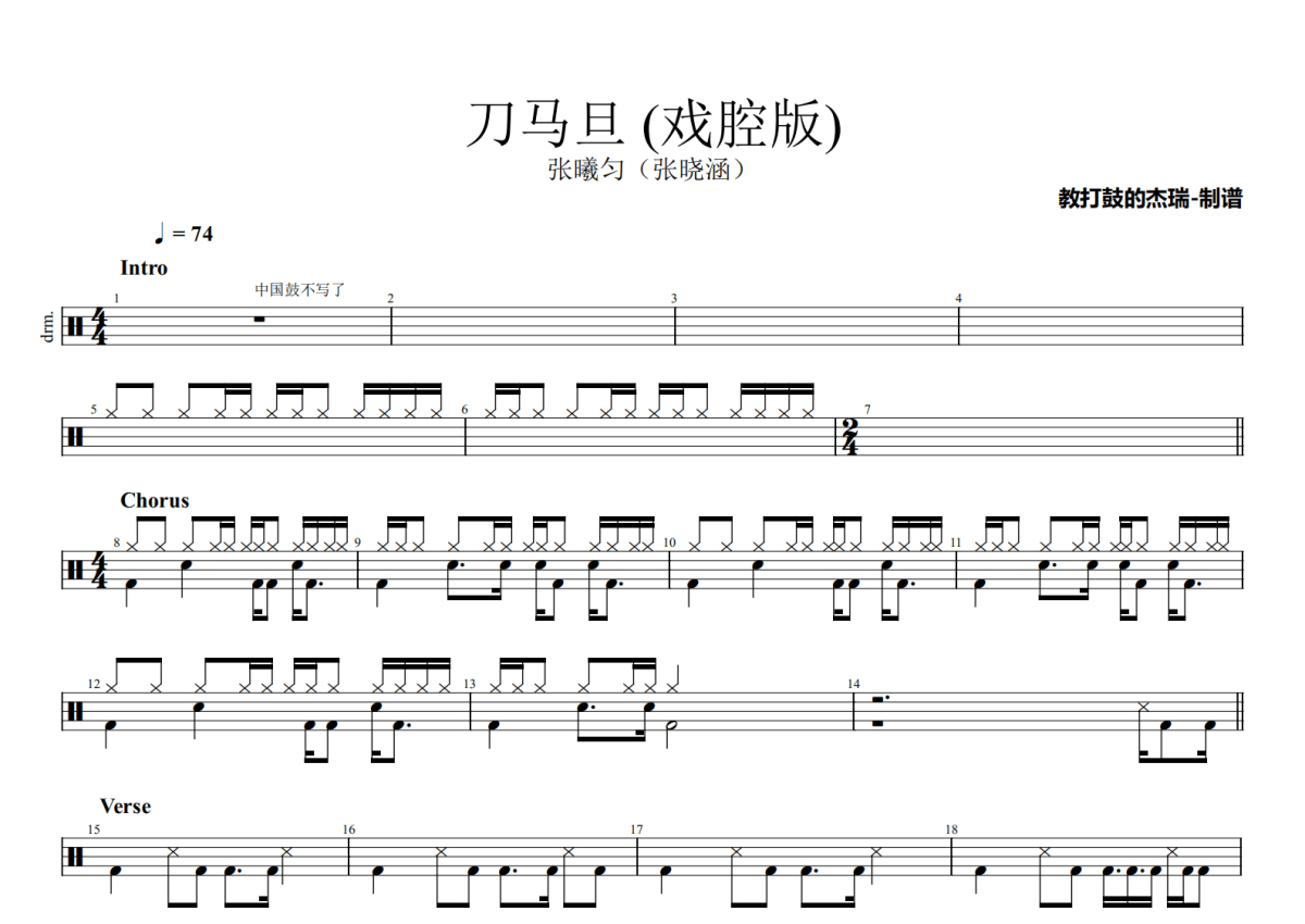 《刀马旦 (戏腔版)》是张曦匀(张晓涵)演唱的一首歌曲,拍号为4/4拍,歌曲速度为每分钟74拍,这份架子鼓谱共有两张高清图谱,图谱由 @Jerry 编配上传,图谱使用五线谱编配,使用这份刀马旦 (戏腔版)架子鼓谱,你将能够轻松地敲打出这首张曦匀(张晓涵)的刀马旦 (戏腔版),快来尝试吧。