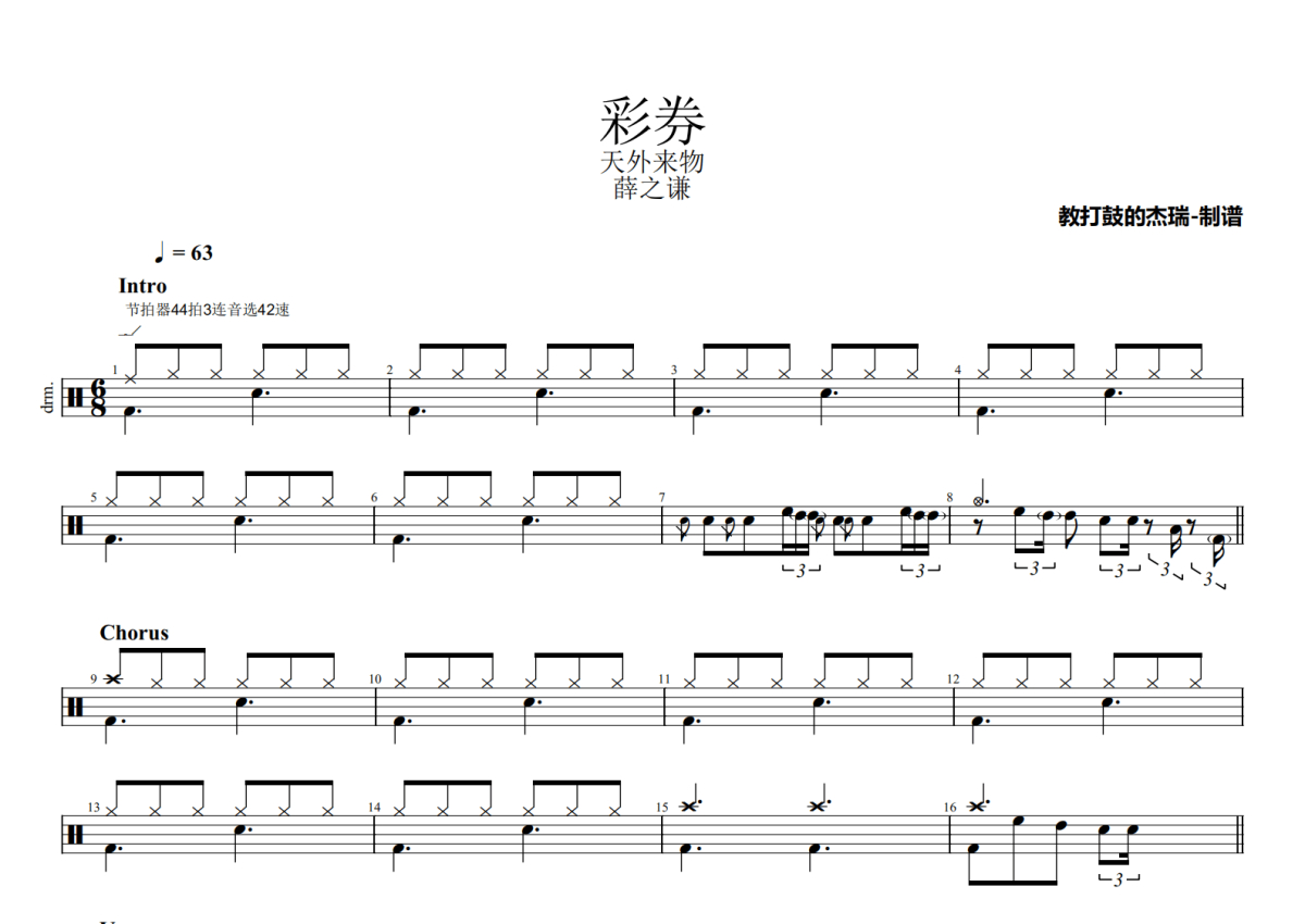 《彩券》是薛之谦演唱的一首歌曲,拍号为6/8拍,歌曲速度为每分钟63拍,这份架子鼓谱共有三张高清图谱,图谱由 @Jerry 编配上传,图谱使用五线谱编配,使用这份彩券架子鼓谱,你将能够轻松地敲打出这首薛之谦的彩券,快来尝试吧。