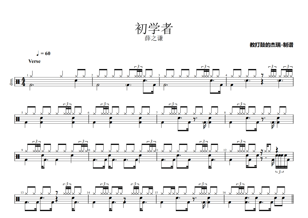 《初学者》是薛之谦演唱的一首歌曲,拍号为4/4拍,歌曲速度为每分钟60拍,这份架子鼓谱共有两张高清图谱,图谱由 @Jerry 编配上传,图谱使用五线谱编配,使用这份初学者架子鼓谱,你将能够轻松地敲打出这首薛之谦的初学者,快来尝试吧。