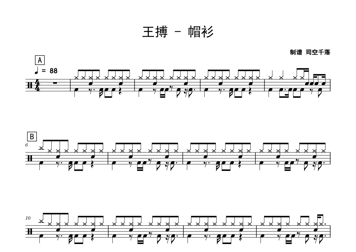 《帽衫》是王搏演唱的一首歌曲,这份架子鼓谱共有一张高清图谱,图谱由 @司空千落 编配上传,图谱使用五线谱编配,使用这份帽衫架子鼓谱,你将能够轻松地敲打出这首王搏的帽衫,快来尝试吧。