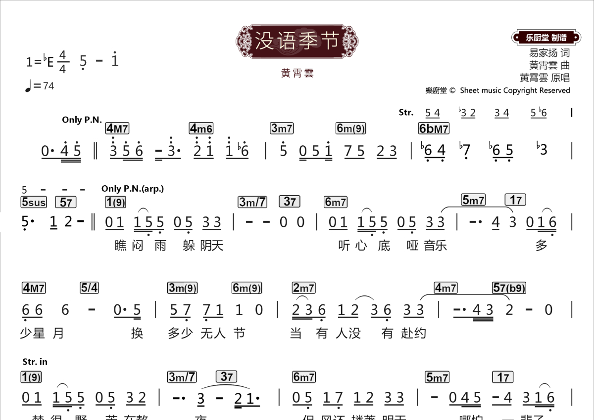 《没语季节》是黄霄雲演唱的一首歌曲,这份乐队总谱共有三张高清图谱,图谱由 @乐厨堂 编配上传职业LIVE乐手现场伴奏谱,适合用于标准配置的乐队排练,以及原版的应急演出即兴伴奏;同时适合有读谱能力的职业歌手更快熟悉新歌。