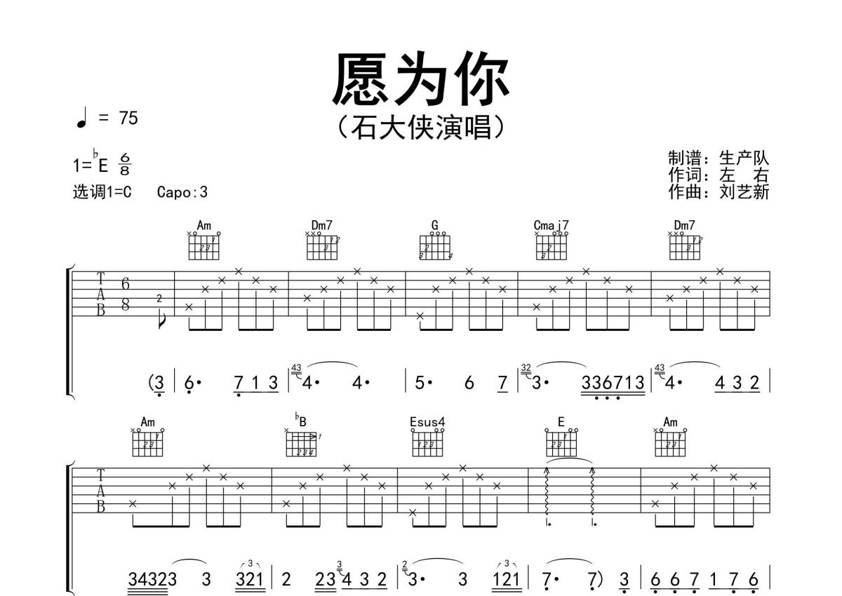 《愿为你》是石大侠(石颖)演唱的一首歌曲,精编完美版,拍号为6/8拍,歌曲速度为每分钟75拍,歌曲原调为Eb调,但由于原调指法比较难,为了方便弹奏,本吉他谱采用的是C调指法编配,变调夹3品弹奏即为原调,当然也可以根据自己的音域改变变调夹位置,或者通过改变和弦调性,以方便自己弹奏,这份吉他谱共有三张高清图谱,图谱由 @生产队 编配上传,图谱使用六线谱编配,包含吉他和弦指法、简谱以及歌词部分,使用这份愿为你吉他谱,可以让你更加方便地掌握这首歌曲的弹唱技巧,快来尝试吧。《愿为你》是由歌手石大侠演唱的最新单曲。本吉他谱根据原版C调指法编配,完整的前奏、间奏和solo编配,精编完美版,值得推荐的一首抒情歌曲。愿为你倾尽年华,愿陪你海角天涯,愿与你朝夕相伴,愿余生皆如初见,愿美好在你身边,愿相看两不厌倦,愿岁月可以回首,与你深情共白头!。