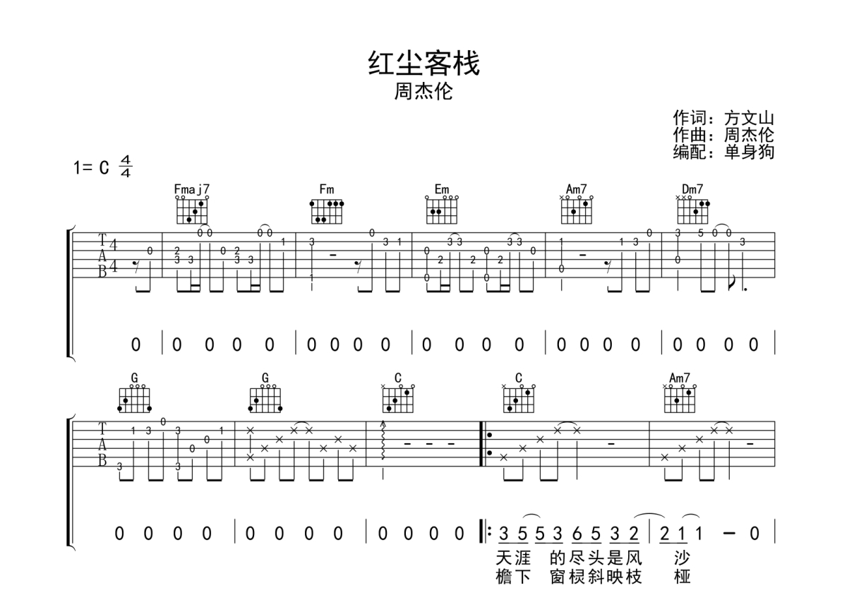 红尘客栈吉他谱 - 周杰伦 - C调弹唱六线谱