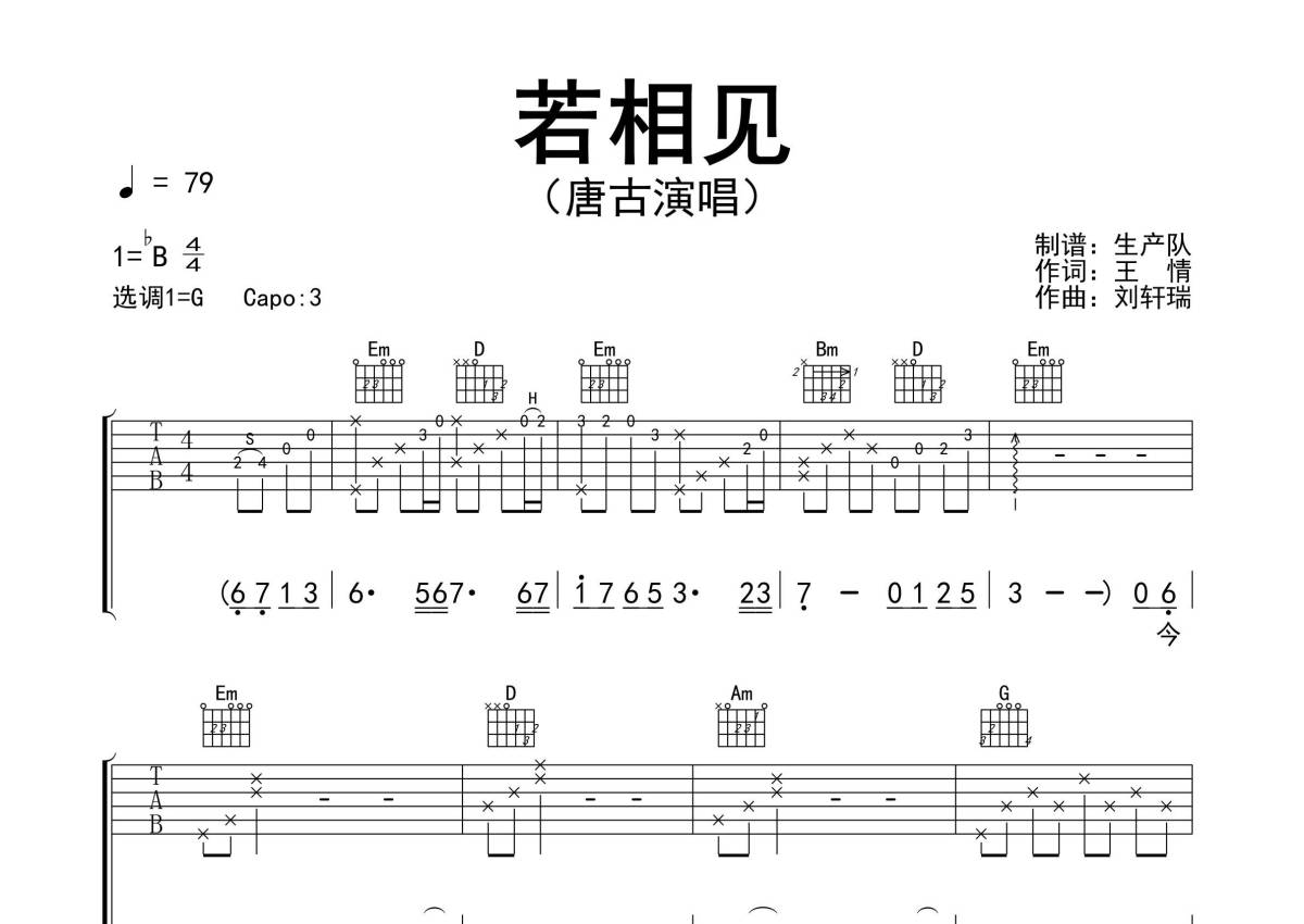 《若相见》是唐古演唱的一首歌曲,精编完美版,拍号为4/4拍,歌曲速度为每分钟79拍,歌曲原调为Bb调,但由于原调指法比较难,为了方便弹奏,本吉他谱采用的是G调指法编配,变调夹3品弹奏即为原调,当然也可以根据自己的音域改变变调夹位置,或者通过改变和弦调性,以方便自己弹奏,这份吉他谱共有三张高清图谱,图谱由 @生产队 编配上传,图谱使用六线谱编配,包含吉他和弦指法、简谱以及歌词部分,使用这份若相见吉他谱,可以让你更加方便地掌握这首歌曲的弹唱技巧,快来尝试吧。《若相见》是由歌手唐古演唱的最新单曲。本吉他谱根据原版G调指法编配,完整的前奏、间奏、尾奏solo编配,精编完美版,非常动听的一首抒情歌曲,值得推荐。人海茫茫若有缘与你相见,我会用一生弥补对你的亏欠,希望你我的心中不会有遗憾,彼此珍惜所留下的时间。