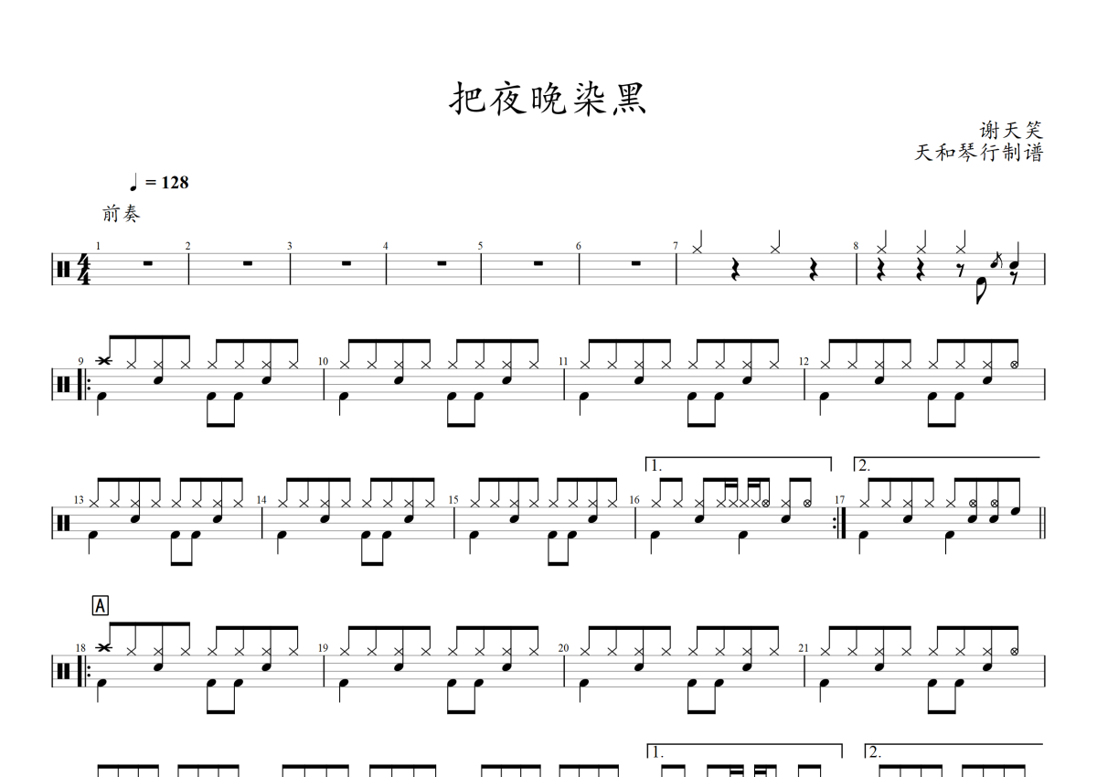 《把夜晚染黑》是谢天笑演唱的一首歌曲,拍号为4/4拍,歌曲速度为每分钟128拍,这份架子鼓谱共有三张高清图谱,图谱由 @音符喷血者 编配上传,图谱使用五线谱编配,使用这份把夜晚染黑架子鼓谱,你将能够轻松地敲打出这首谢天笑的把夜晚染黑,快来尝试吧。