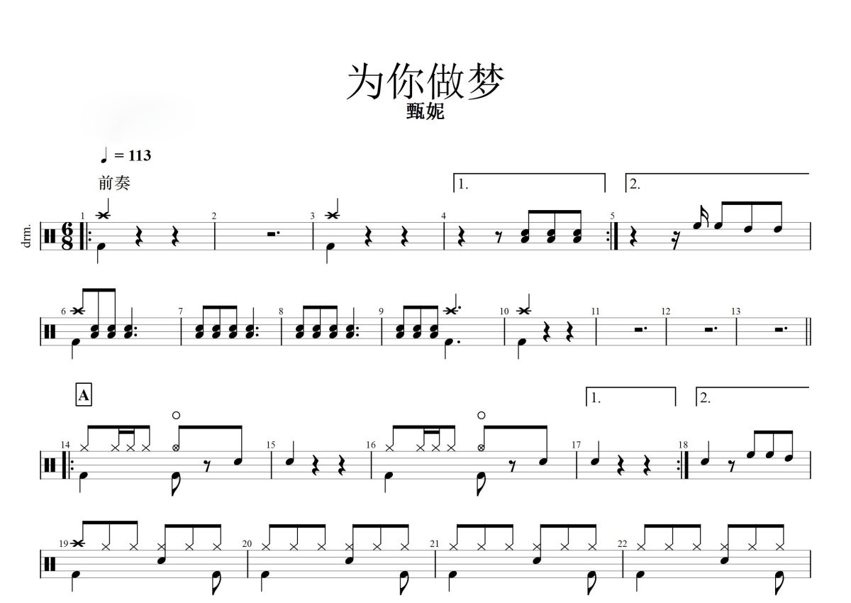 《为你做梦》是甄妮演唱的一首歌曲,这份鼓谱共有三张高清图谱,图谱由 @打鼓谱 编配上传,图谱使用五线谱编配,使用这份为你做梦架子鼓谱,你将能够轻松地敲打出这首甄妮的为你做梦,快来尝试吧。歌曲名《为你做梦》,由 甄妮 演唱,收录于《精装甄妮》专辑中。