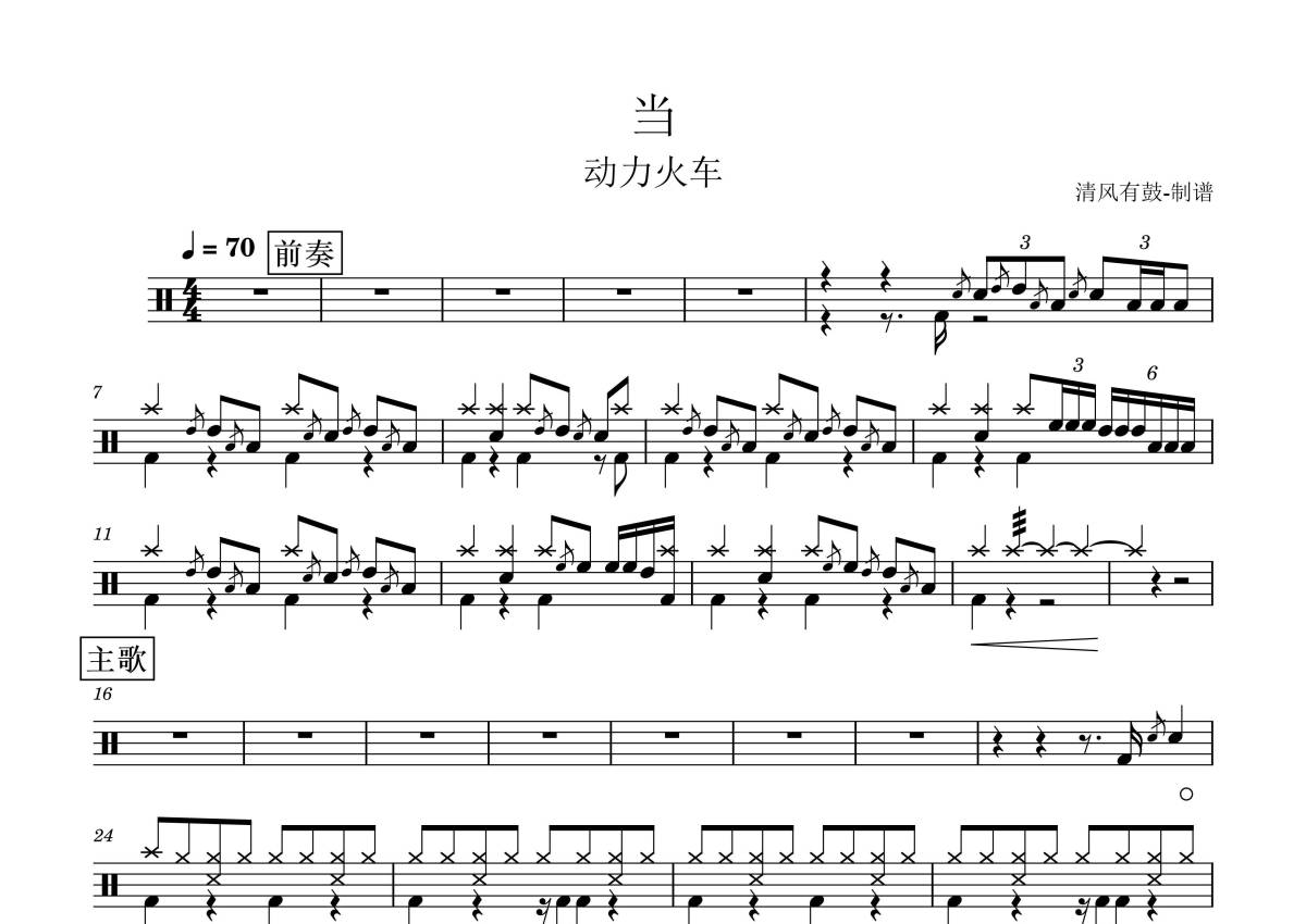 《当》是动力火车演唱的一首歌曲,拍号为4/4拍,歌曲速度为每分钟70拍,这份架子鼓谱共有三张高清图谱,图谱由 @清风有鼓 编配上传,图谱使用五线谱编配,使用这份当架子鼓谱,你将能够轻松地敲打出这首动力火车的当,快来尝试吧。