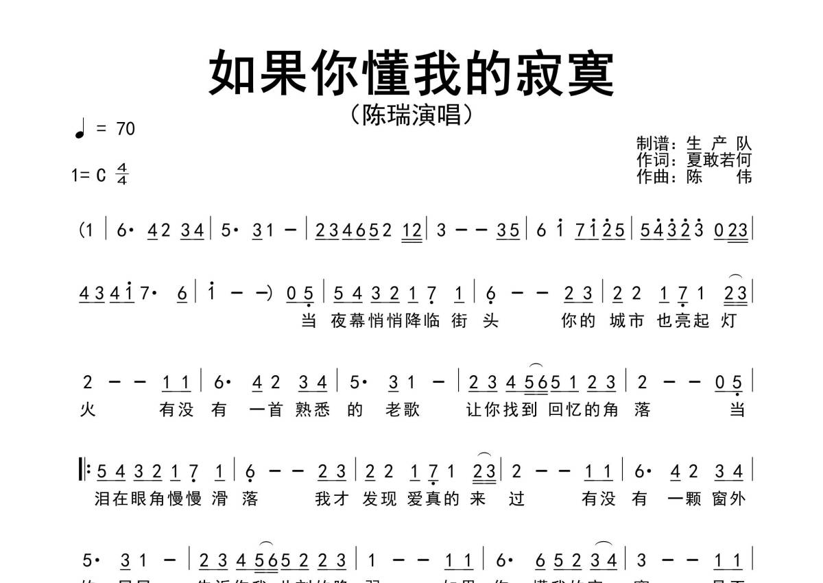 《如果你懂我的寂寞》是陈瑞演唱的一首歌曲,原版简谱,拍号为4/4拍,歌曲速度为每分钟70拍,这份简谱共有一张高清图谱,图谱由 @生产队 编配上传陈瑞演唱的歌曲《如果你懂我的寂寞》原版简谱。