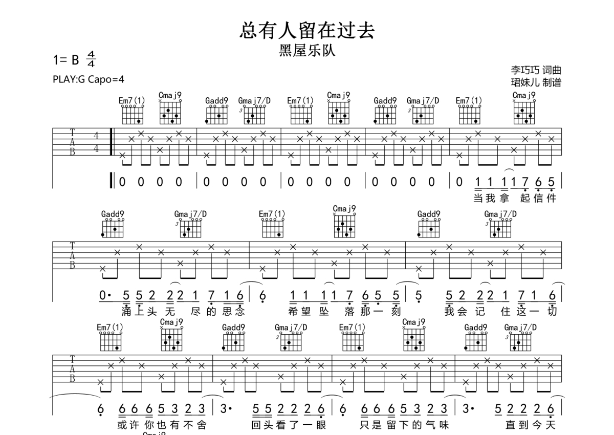 《总有人留在过去》是黑屋乐队演唱的一首歌曲,拍号为4/4拍,歌曲速度为每分钟85拍,歌曲原调为B调,但由于原调指法比较难,为了方便弹奏,本吉他谱采用的是G调指法编配,变调夹4品弹奏即为原调,当然也可以根据自己的音域改变变调夹位置,或者通过改变和弦调性,以方便自己弹奏,这份吉他谱共有两张高清图谱,图谱由 @珺妹儿 编配上传,图谱使用六线谱编配,包含吉他和弦指法、简谱以及歌词部分,使用这份总有人留在过去吉他谱,可以让你更加方便地掌握这首歌曲的弹唱技巧,快来尝试吧。