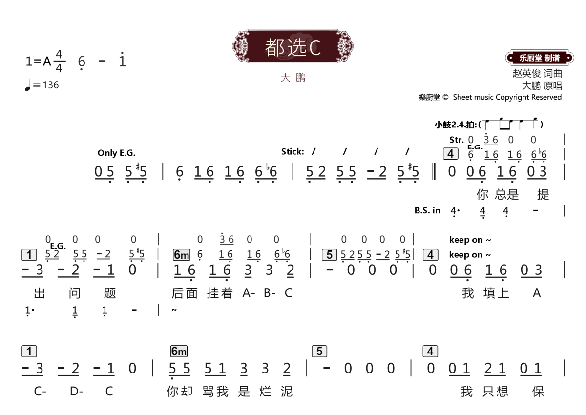 《都选C》是大鹏演唱的一首歌曲,拍号为4/4拍,这份乐队总谱共有三张高清图谱,图谱由 @乐厨堂 编配上传职业LIVE乐手现场伴奏谱,适合用于标准配置的乐队排练,以及原版的应急演出即兴伴奏;同时适合有读谱能力的职业歌手更快熟悉新歌。