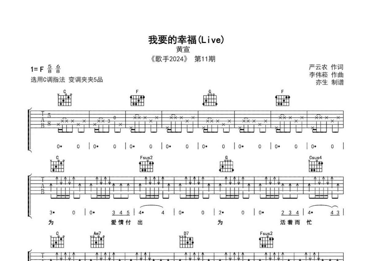《我要的幸福》是黄宣演唱的一首歌曲,拍号为4/4拍,歌曲原调为F调,但由于原调指法比较难,为了方便弹奏,本吉他谱采用的是C调指法编配,变调夹5品弹奏即为原调,当然也可以根据自己的音域改变变调夹位置,或者通过改变和弦调性,以方便自己弹奏,这份吉他谱共有三张高清图谱,图谱由 @亦生 编配上传,图谱使用六线谱编配,包含吉他和弦指法、简谱以及歌词部分,使用这份我要的幸福吉他谱,可以让你更加方便地掌握这首歌曲的弹唱技巧,快来尝试吧。