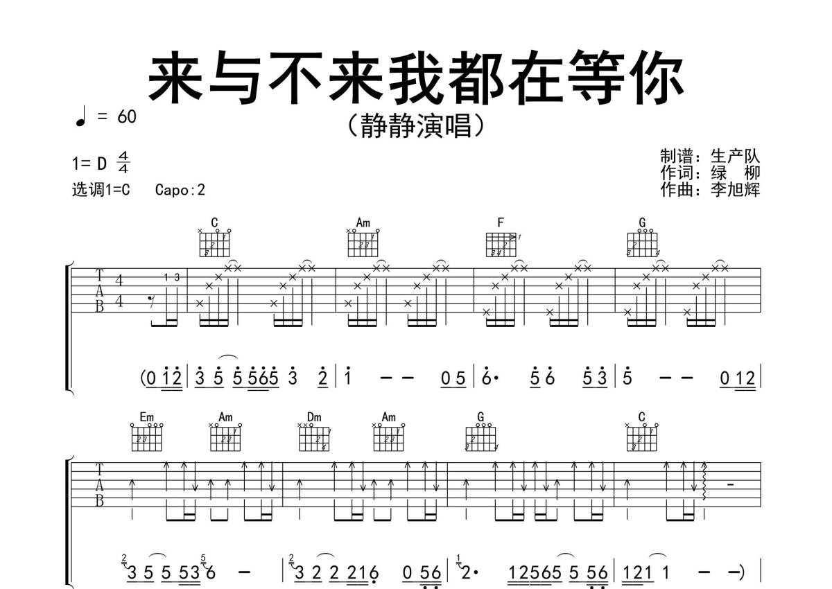 《来与不来我都在等你》是静静演唱的一首歌曲,精编完美版,拍号为4/4拍,歌曲速度为每分钟60拍,歌曲原调为D调,但由于原调指法比较难,为了方便弹奏,本吉他谱采用的是C调指法编配,变调夹2品弹奏即为原调,当然也可以根据自己的音域改变变调夹位置,或者通过改变和弦调性,以方便自己弹奏,这份吉他谱共有三张高清图谱,图谱由 @生产队 编配上传,图谱使用六线谱编配,包含吉他和弦指法、简谱以及歌词部分,使用这份来与不来我都在等你吉他谱,可以让你更加方便地掌握这首歌曲的弹唱技巧,快来尝试吧。《来与不来我都在等你》是由中国内地女歌手静静演唱的歌曲。本吉他谱根据原版C调指法编配,完整的前奏、间奏和solo编配,一首动听的抒情歌曲,值得推荐。你来与不来我都在等你,等你和我去看落花满地;你来与不来我都在等你,等你和我去听落叶絮语。