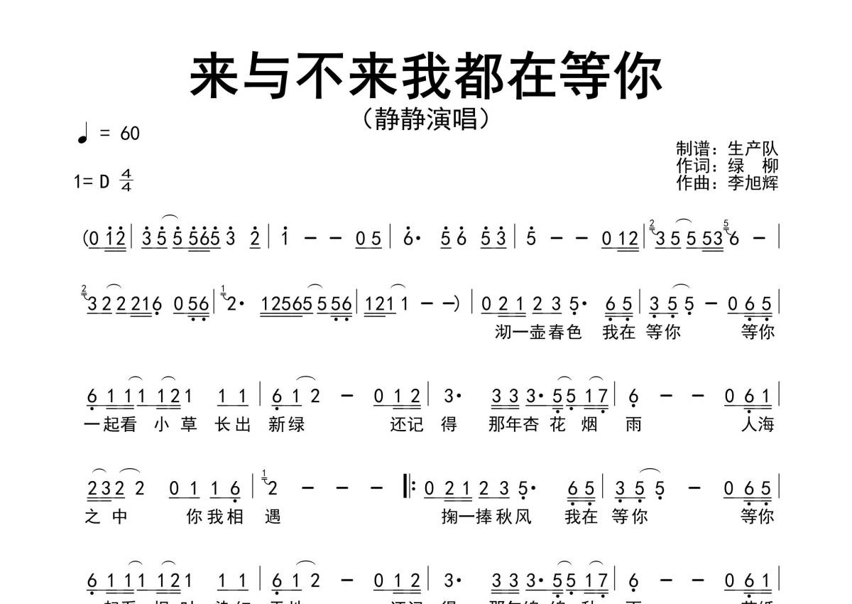 《来与不来我都在等你》是静静演唱的一首歌曲,原版简谱,拍号为4/4拍,歌曲速度为每分钟60拍,这份简谱共有一张高清图谱,图谱由 @生产队 编配上传《来与不来我都在等你》是由中国内地女歌手静静演唱的歌曲,原版简谱。