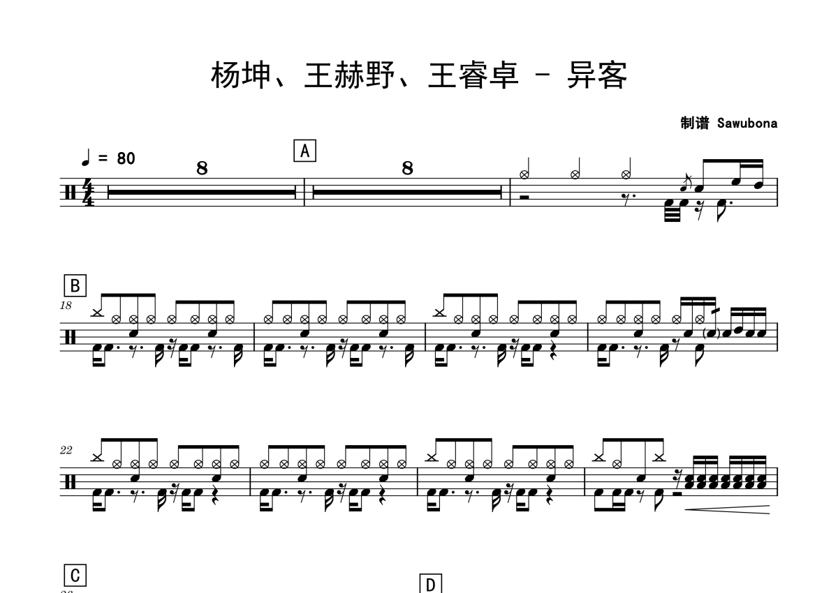 《异客》是杨坤、王赫野、王睿卓演唱的一首歌曲,这份架子鼓谱共有两张高清图谱,图谱由 @Sawubona 编配上传,图谱使用五线谱编配,使用这份异客架子鼓谱,你将能够轻松地敲打出这首杨坤、王赫野、王睿卓的异客,快来尝试吧。