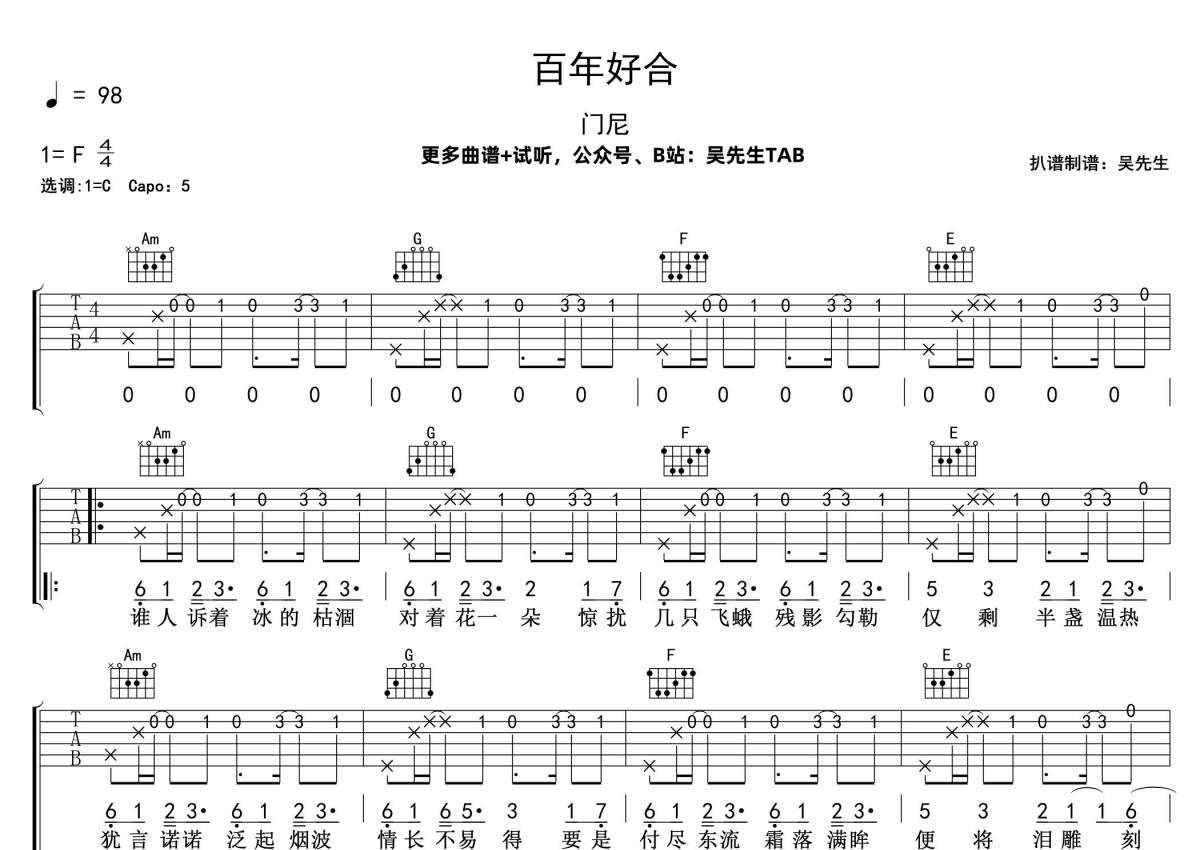 《百年好合》是门尼演唱的一首歌曲,拍号为4/4拍,歌曲速度为每分钟98拍,歌曲原调为F调,但由于原调指法比较难,为了方便弹奏,本吉他谱采用的是C调指法编配,变调夹5品弹奏即为原调,当然也可以根据自己的音域改变变调夹位置,或者通过改变和弦调性,以方便自己弹奏,这份吉他谱共有三张高清图谱,图谱由 @吴先生TAB 编配上传,图谱使用六线谱编配,包含吉他和弦指法、简谱以及歌词部分,曲谱配备了相关的音频提供试听,使用这份百年好合吉他谱,可以让你更加方便地掌握这首歌曲的弹唱技巧,快来尝试吧。