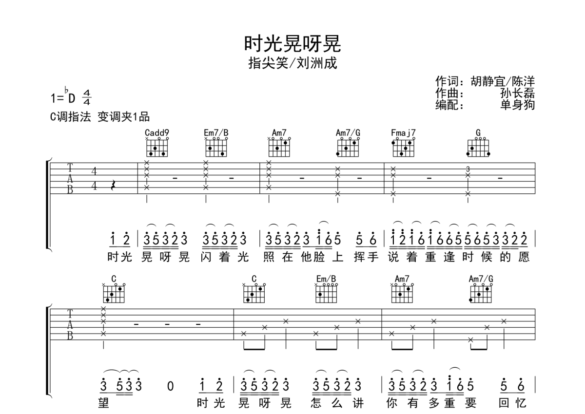 《时光晃呀晃》是指尖笑/刘洲成演唱的一首歌曲,拍号为4/4拍,歌曲原调为Db调,但由于原调指法比较难,为了方便弹奏,本吉他谱采用的是C调指法编配,变调夹1品弹奏即为原调,当然也可以根据自己的音域改变变调夹位置,或者通过改变和弦调性,以方便自己弹奏,这份吉他谱共有四张高清图谱,图谱由 @单身狗 编配上传,图谱使用六线谱编配,包含吉他和弦指法、简谱以及歌词部分,使用这份时光晃呀晃吉他谱,可以让你更加方便地掌握这首歌曲的弹唱技巧,快来尝试吧。