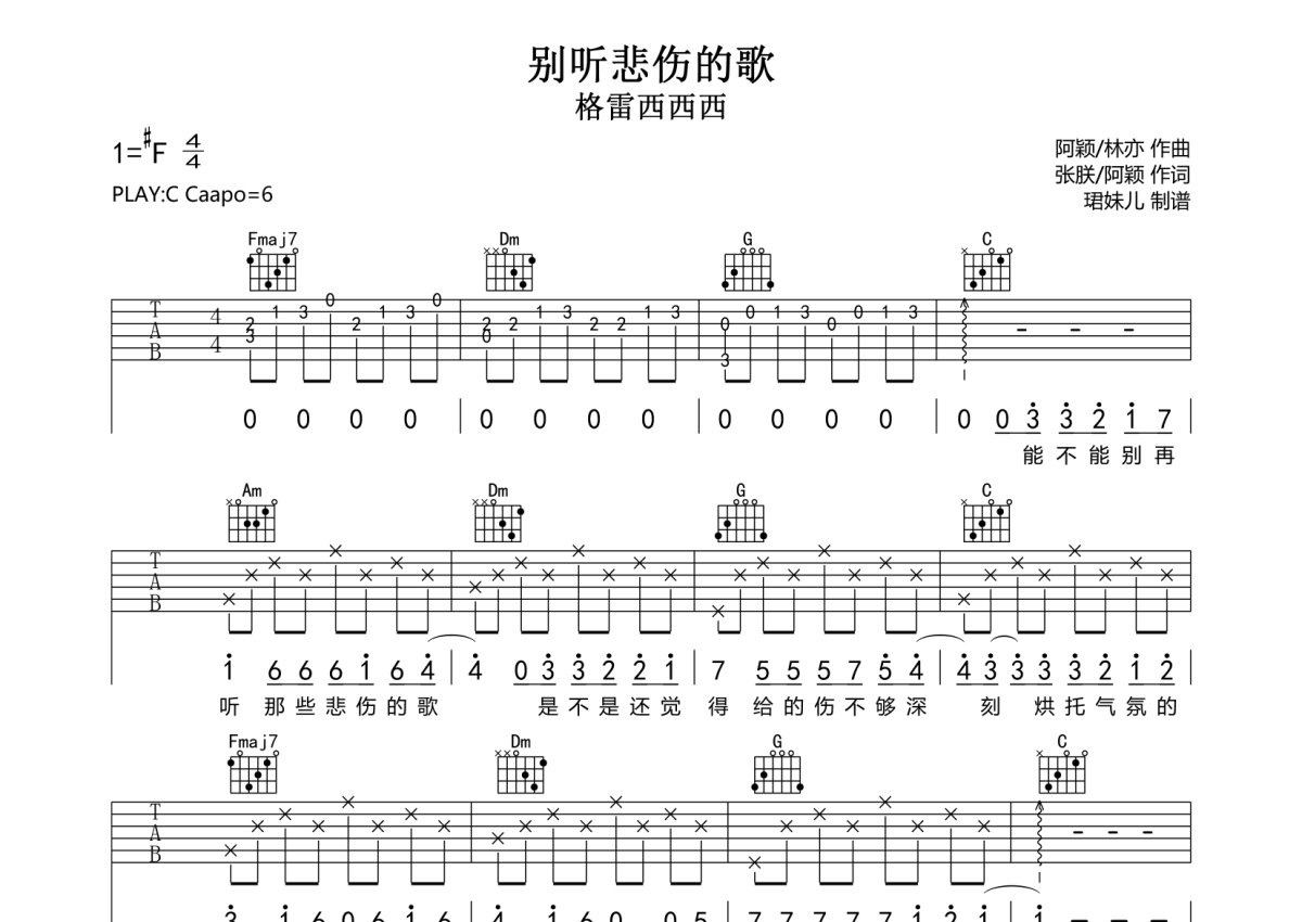 格雷西西西《别听悲伤的歌》吉他谱 - C调弹唱六线谱