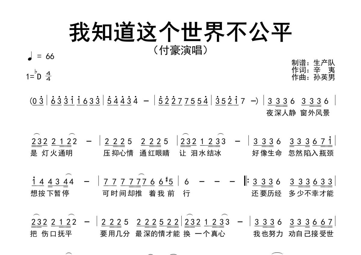 《我知道这个世界不公平》是付豪演唱的一首歌曲,原版简谱,拍号为4/4拍,歌曲速度为每分钟66拍,这份简谱共有一张高清图谱,图谱由 @生产队 编配上传付豪演唱的最新单曲 《我知道这个世界不公平》原版简谱。
