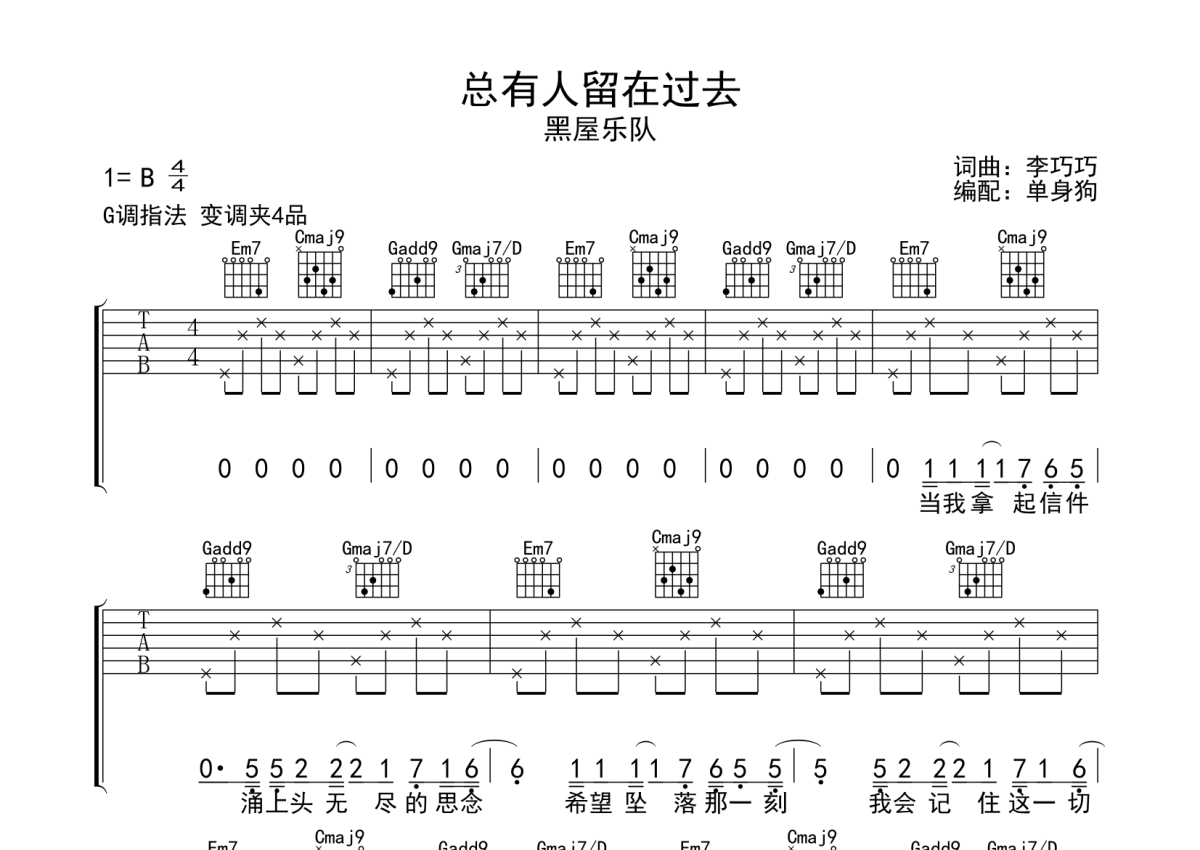 《总有人留在过去》是黑屋乐队演唱的一首歌曲,拍号为4/4拍,歌曲原调为B调,但由于原调指法比较难,为了方便弹奏,本吉他谱采用的是G调指法编配,变调夹4品弹奏即为原调,当然也可以根据自己的音域改变变调夹位置,或者通过改变和弦调性,以方便自己弹奏,这份吉他谱共有三张高清图谱,图谱由 @单身狗 编配上传,图谱使用六线谱编配,包含吉他和弦指法、简谱以及歌词部分,使用这份总有人留在过去吉他谱,可以让你更加方便地掌握这首歌曲的弹唱技巧,快来尝试吧。