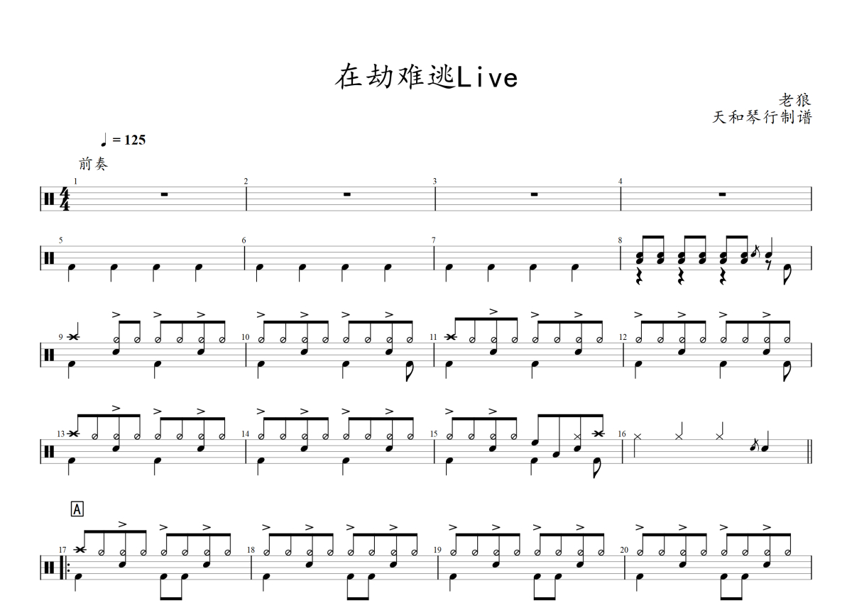 《在劫难逃Live》是老狼演唱的一首歌曲,拍号为4/4拍,歌曲速度为每分钟125拍,这份架子鼓谱共有三张高清图谱,图谱由 @音符喷血者 编配上传,图谱使用五线谱编配,使用这份在劫难逃Live架子鼓谱,你将能够轻松地敲打出这首老狼的在劫难逃Live,快来尝试吧。