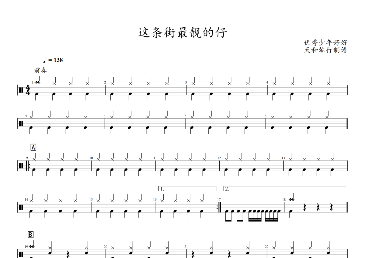 《这条街最靓的仔》是优秀少年好好演唱的一首歌曲,拍号为4/4拍,歌曲速度为每分钟138拍,这份架子鼓谱共有两张高清图谱,图谱由 @音符喷血者 编配上传,图谱使用五线谱编配,使用这份这条街最靓的仔架子鼓谱,你将能够轻松地敲打出这首优秀少年好好的这条街最靓的仔,快来尝试吧。
