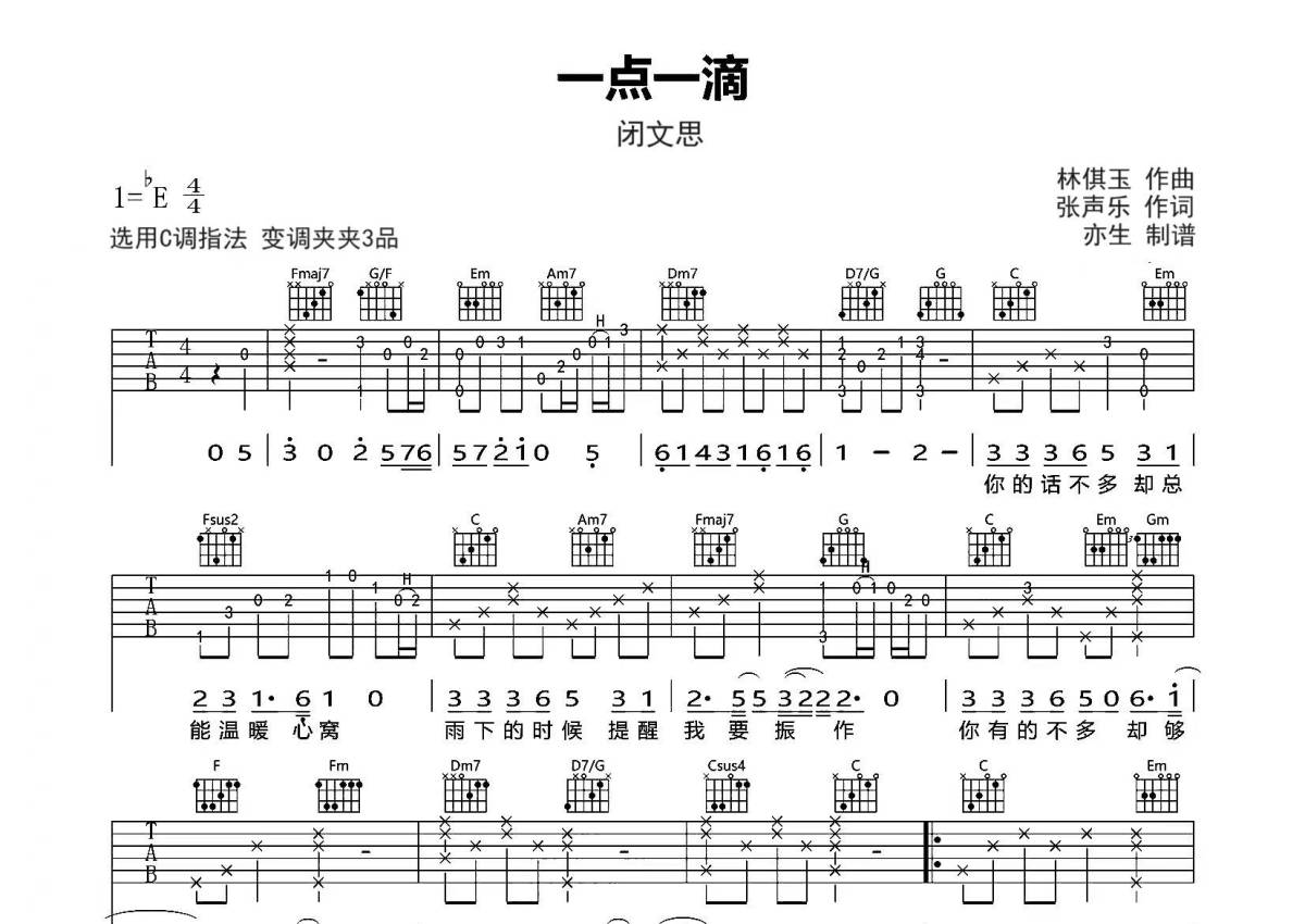 《一点一滴》是闭文思演唱的一首歌曲,拍号为4/4拍,歌曲原调为Eb调,但由于原调指法比较难,为了方便弹奏,本吉他谱采用的是C调指法编配,变调夹3品弹奏即为原调,当然也可以根据自己的音域改变变调夹位置,或者通过改变和弦调性,以方便自己弹奏,这份吉他谱共有两张高清图谱,图谱由 @亦生 编配上传,图谱使用六线谱编配,包含吉他和弦指法、简谱以及歌词部分,使用这份一点一滴吉他谱,可以让你更加方便地掌握这首歌曲的弹唱技巧,快来尝试吧。