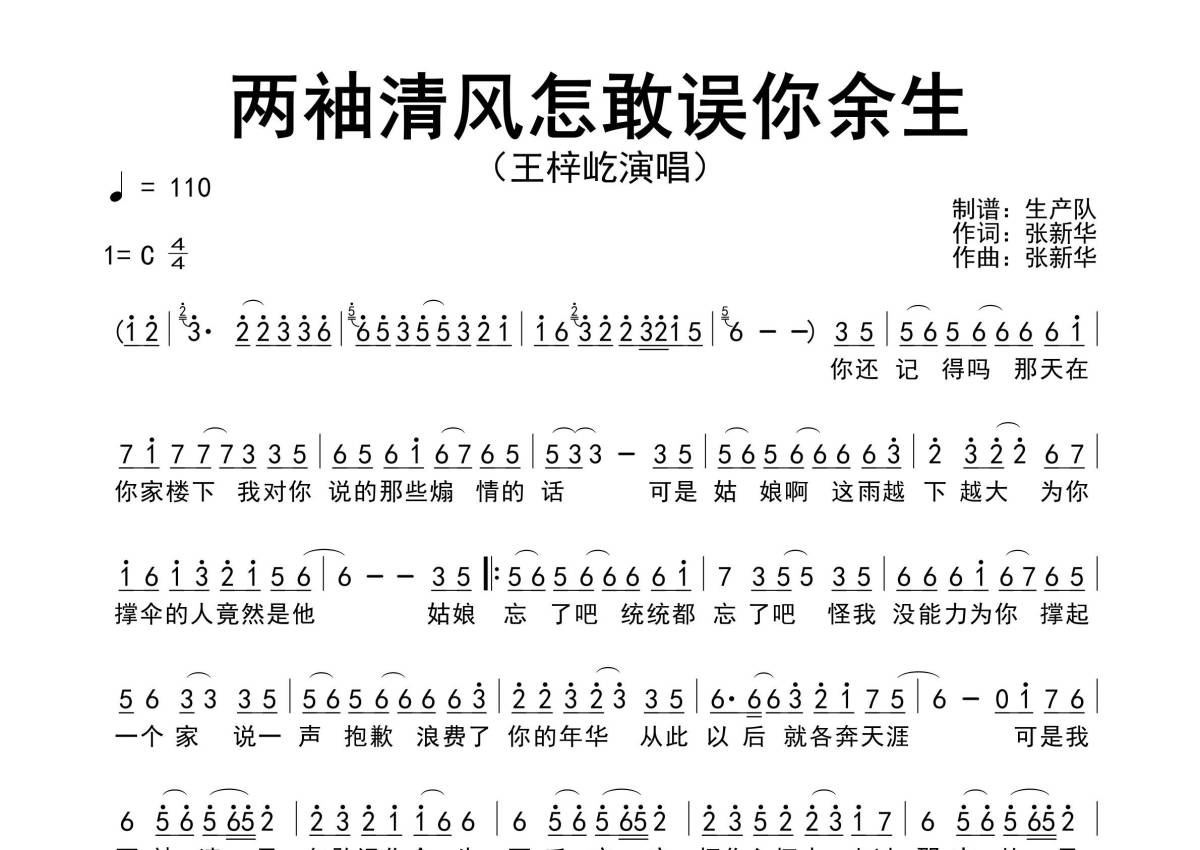 《两袖清风怎敢误你余生》是王梓屹演唱的一首歌曲,原版简谱,拍号为4/4拍,歌曲速度为每分钟110拍,这份简谱共有一张高清图谱,图谱由 @生产队 编配上传王梓屹演唱的最新单曲《两袖清风怎敢误你余生》原版简谱。
