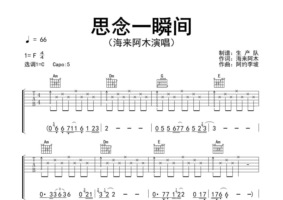 《思念一瞬间》是海来阿木演唱的一首歌曲,精编完美版,拍号为4/4拍,歌曲速度为每分钟66拍,歌曲原调为F调,但由于原调指法比较难,为了方便弹奏,本吉他谱采用的是C调指法编配,变调夹5品弹奏即为原调,当然也可以根据自己的音域改变变调夹位置,或者通过改变和弦调性,以方便自己弹奏,这份吉他谱共有三张高清图谱,图谱由 @生产队 编配上传,图谱使用六线谱编配,包含吉他和弦指法、简谱以及歌词部分,使用这份思念一瞬间吉他谱,可以让你更加方便地掌握这首歌曲的弹唱技巧,快来尝试吧。《思念一瞬间》是由海来阿木演唱的歌曲。本吉他谱根据原版C调指法编配,完整的前奏、间奏和solo编配,精编完美版,值得推荐的抒情歌曲。爱上你就是一瞬间,思念就成了一辈子,在离开时来不及说声再见,就这样你狠心离我而去。