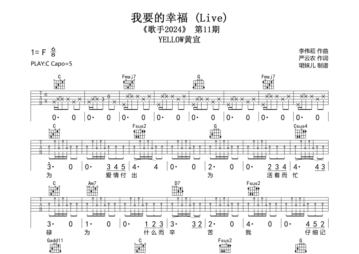 《我要的幸福》是YELLOW黄宣演唱的一首歌曲,拍号为4/4拍,歌曲速度为每分钟85拍,歌曲原调为C调,本吉他谱采用的是C调指法编配,变调夹5品弹奏即为原调,当然也可以根据自己的音域改变变调夹位置,或者通过改变和弦调性,以方便自己弹奏,这份吉他谱共有两张高清图谱,图谱由 @珺妹儿 编配上传,图谱使用六线谱编配,包含吉他和弦指法、简谱以及歌词部分,使用这份我要的幸福吉他谱,可以让你更加方便地掌握这首歌曲的弹唱技巧,快来尝试吧。