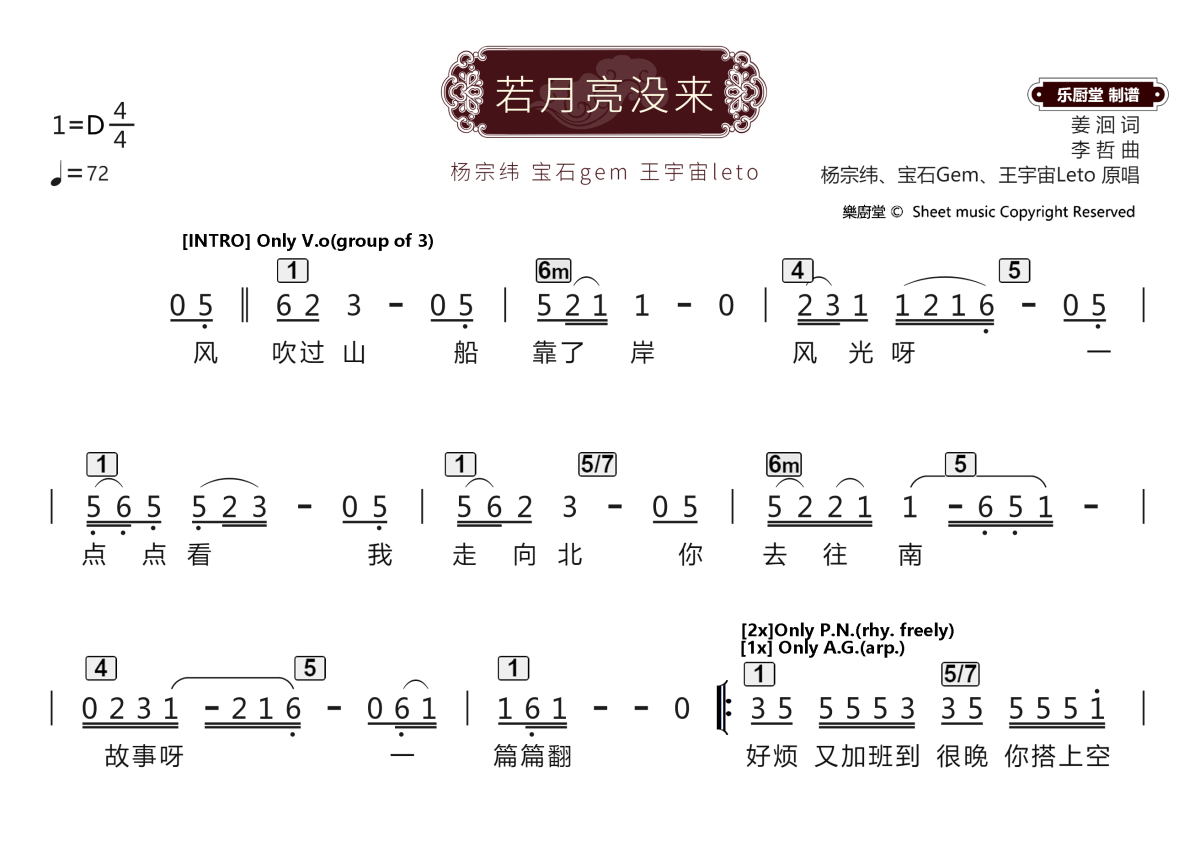 《若月亮没来》是杨宗纬、宝石gem、王宇宙leto演唱的一首歌曲,歌曲速度为每分钟72拍,这份乐队总谱共有三张高清图谱,图谱由 @乐厨堂 编配上传乐厨堂©制谱,参照了知名的台湾卓著公司通过二十多年乐谱出版实践,不断改良迭代后呈现已比较完美的最简明易读记谱方式和排版风格,以华人职业乐手圈通行记录标准,同时配上完整的旋律歌谱作为参照,极大方便了排练和演奏,乐厨堂团队在制谱过程中严格遵循原版段落架构、和声设计和织体框架,主要提供给专业领域的LIVE乐手应用于排练和现场伴奏,以及应急在做场演出场景时常会出现的原版即兴伴奏突发需求,同时也可适用于有读谱能力的职业歌手更快的学唱新的曲目。